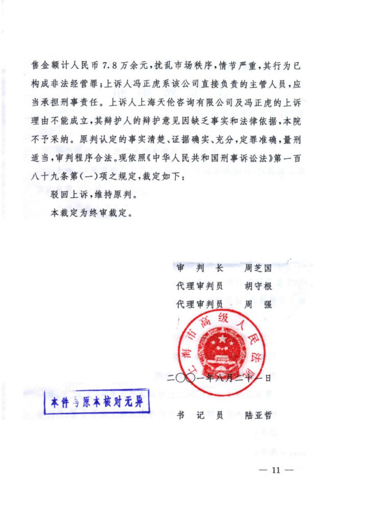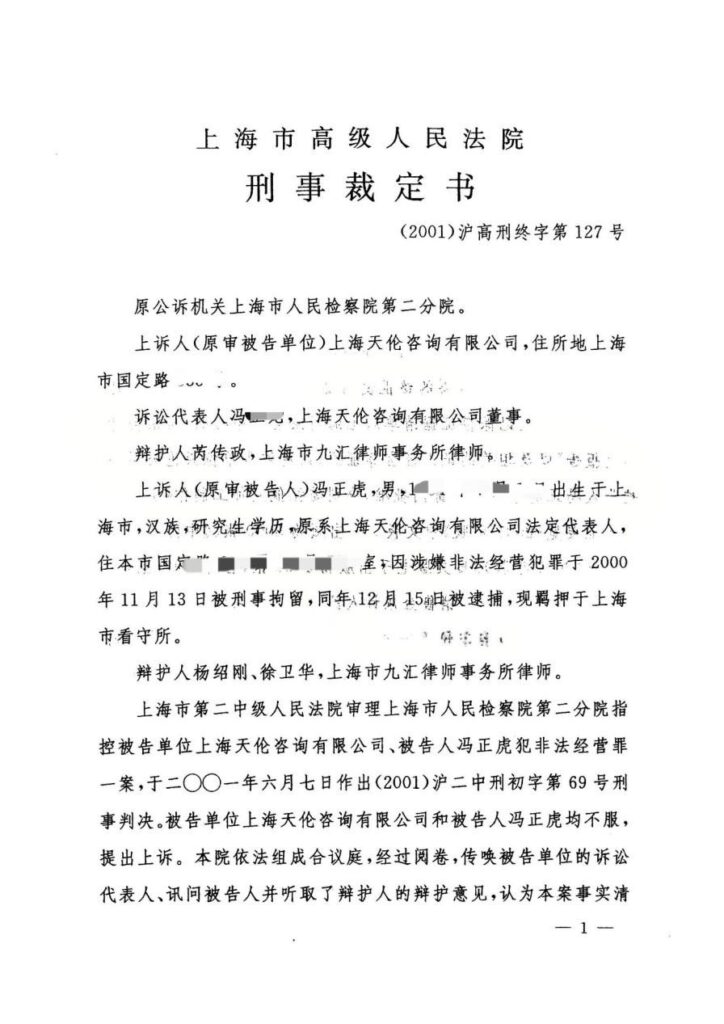 一、《冯正虎:关于冯正虎、上海天伦咨询有限公司非法经营案的法律意见书》