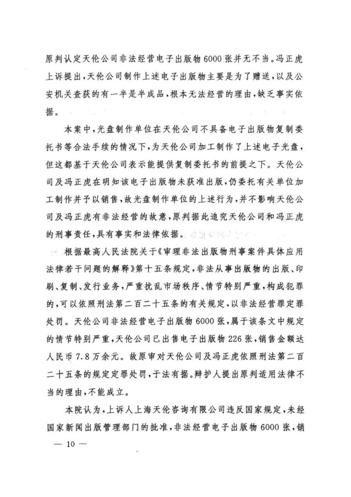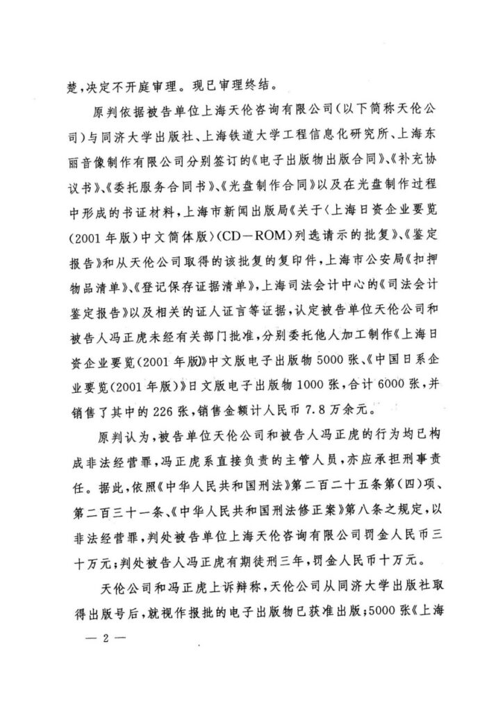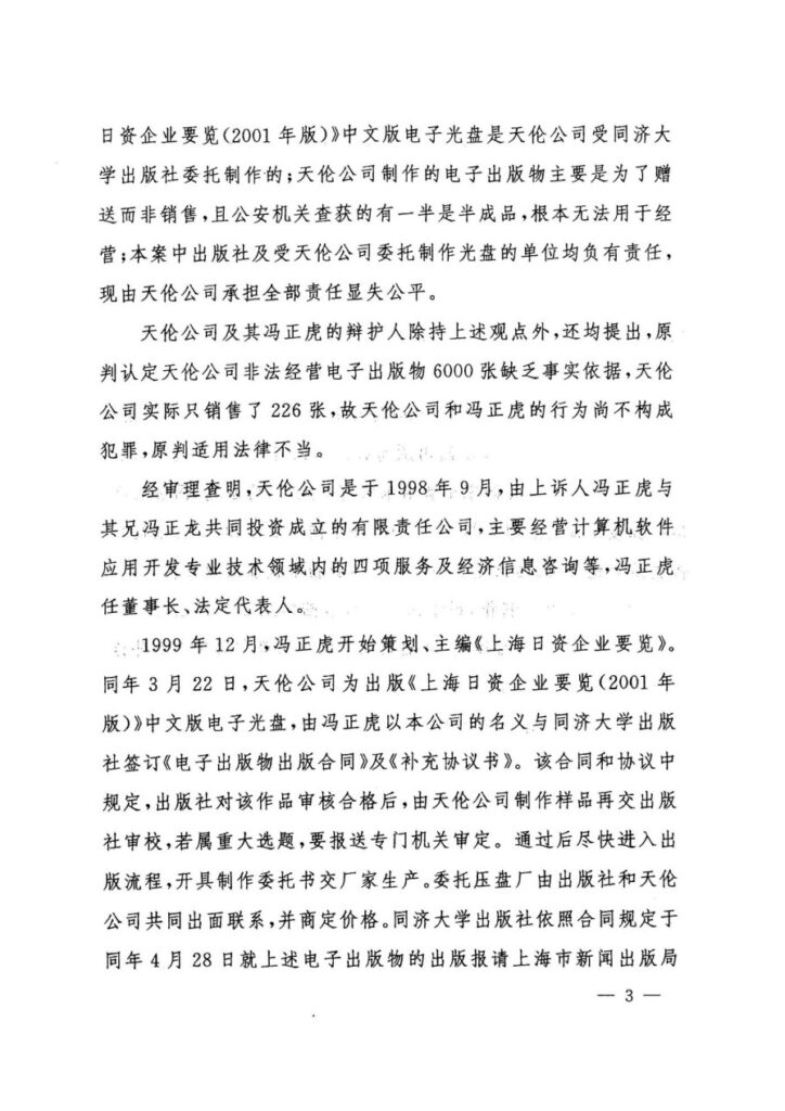 申诉人冯正虎及其公司主张,涉案《上海日资企业要览(2001年版)》光盘系与同济大学出版社依法合作出版并经内部审稿、合法书号授权与委托复制的合规出版物,原判将其定性为“非法出版物”系事实认定与法律适用错误;定案所依的新闻出版局“鉴定报告”主体不适格、程序违法且与书证相矛盾,且案件未达非法经营罪“情节严重”入罪标准,也无“严重扰乱市场秩序”的证据;并揭示二审受“政法委批复”影响而不开庭、剥夺质证与辩论等程序性权利,构成严重程序违法,现以新证据链条申请再审,撤销原判并改判无罪。