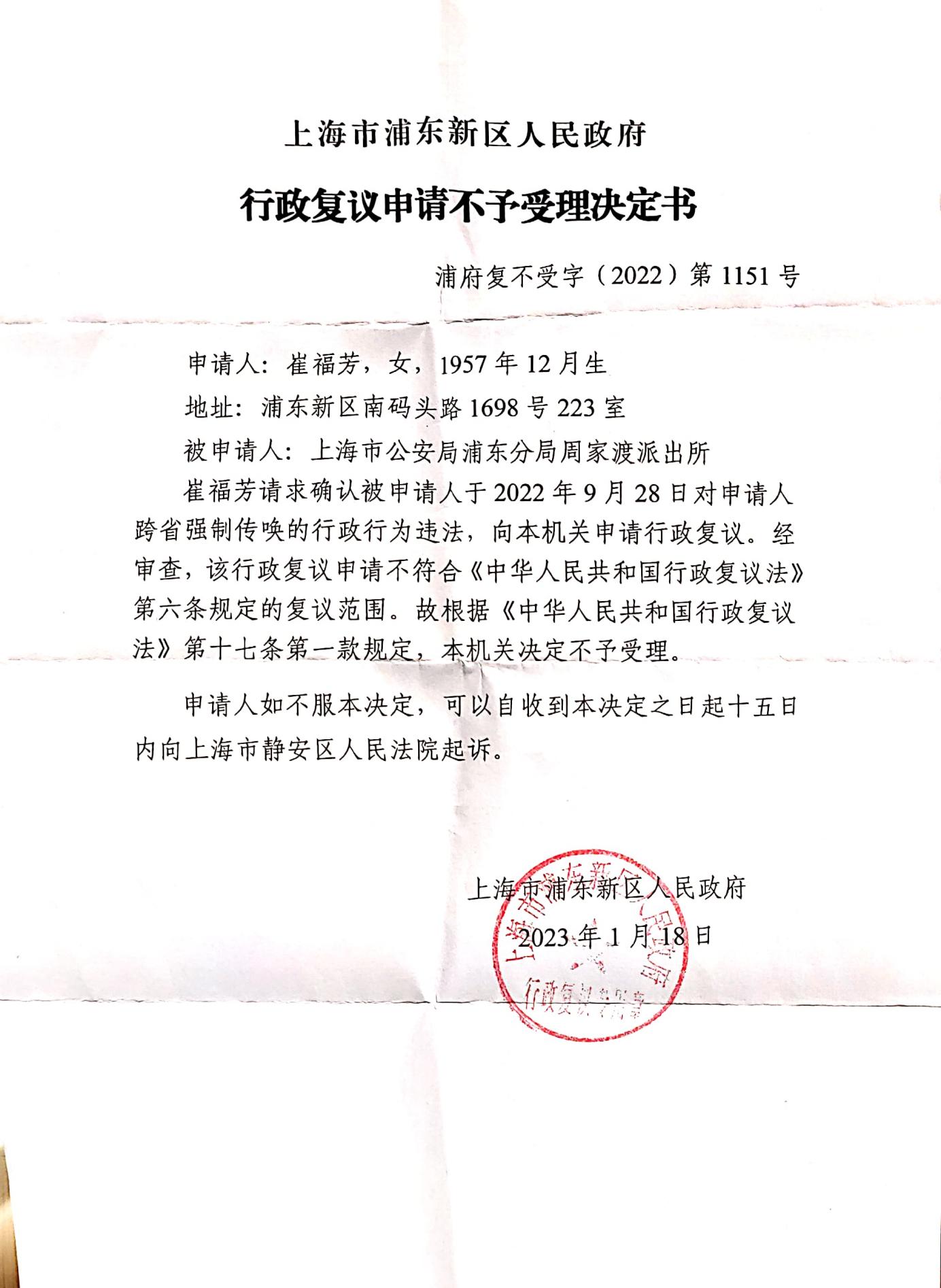 查看更多 »上海公安周家渡派出所对崔福芳跨省强制传唤的行政行为违法